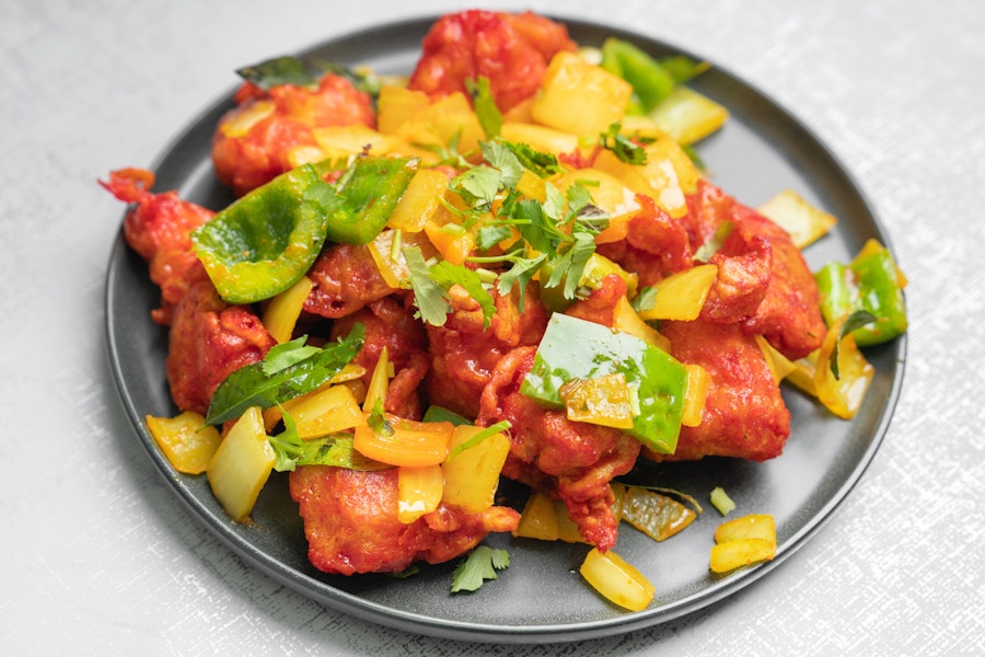 Cottage cheese, onions, bell peppers coated in tangy indo-chinese chili sauce (contains gluten)