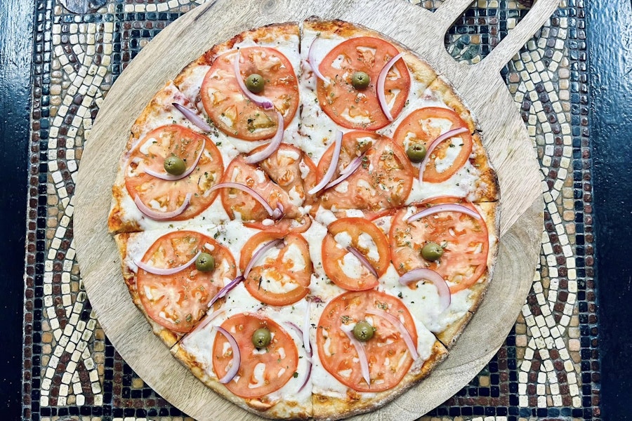 Mozzarella, fresh tomato, onion, fresh garlic, topped with oregano and one green olive per slice