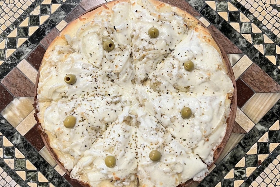 Sauteed onions, melted mozzarella, topped with oregano and one green olive per slice