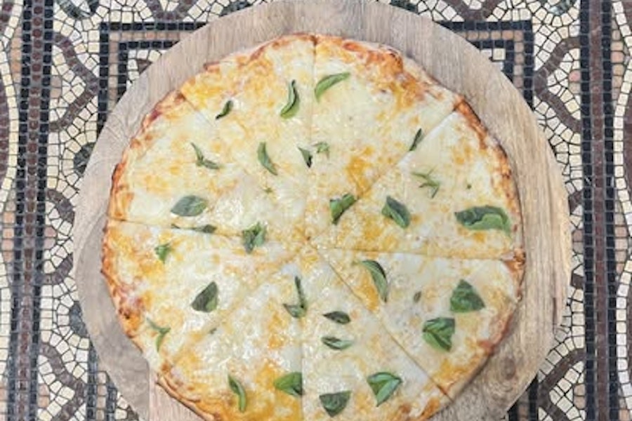 Extra, extra cheese, finished with a light dusting of olive oil, oregano and green olives