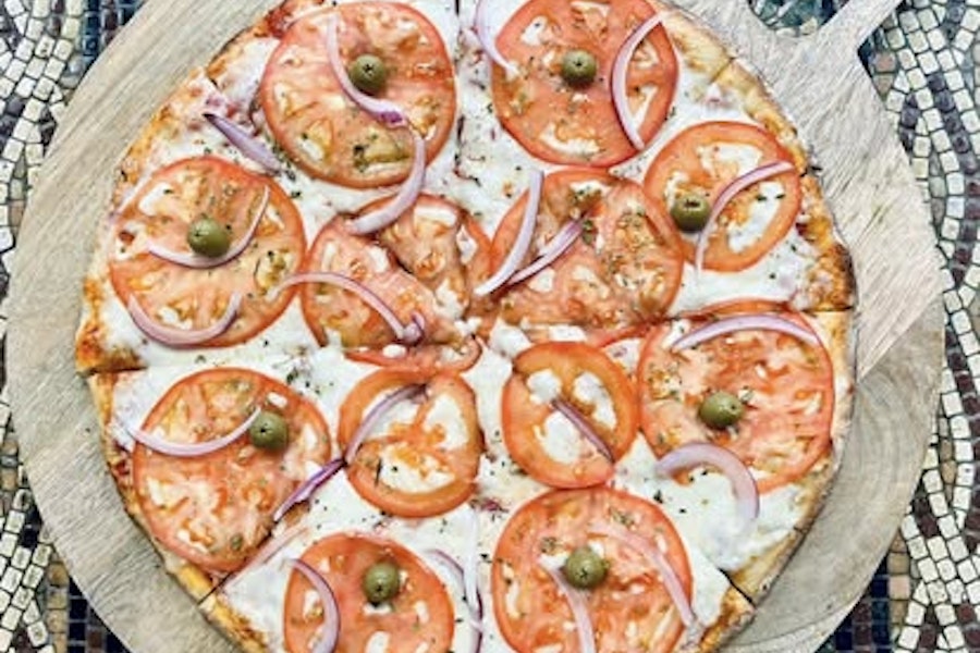 Mozzarella, fresh tomato, onion, fresh garlic, topped with oregano and one green olive per slice