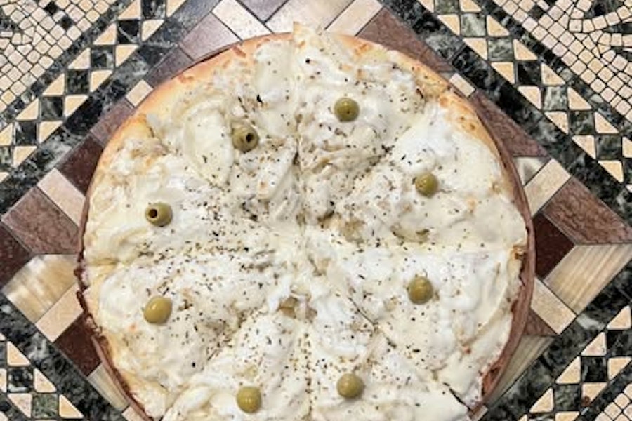 Sauteed onions, melted mozzarella, topped with oregano and one green olive per slice