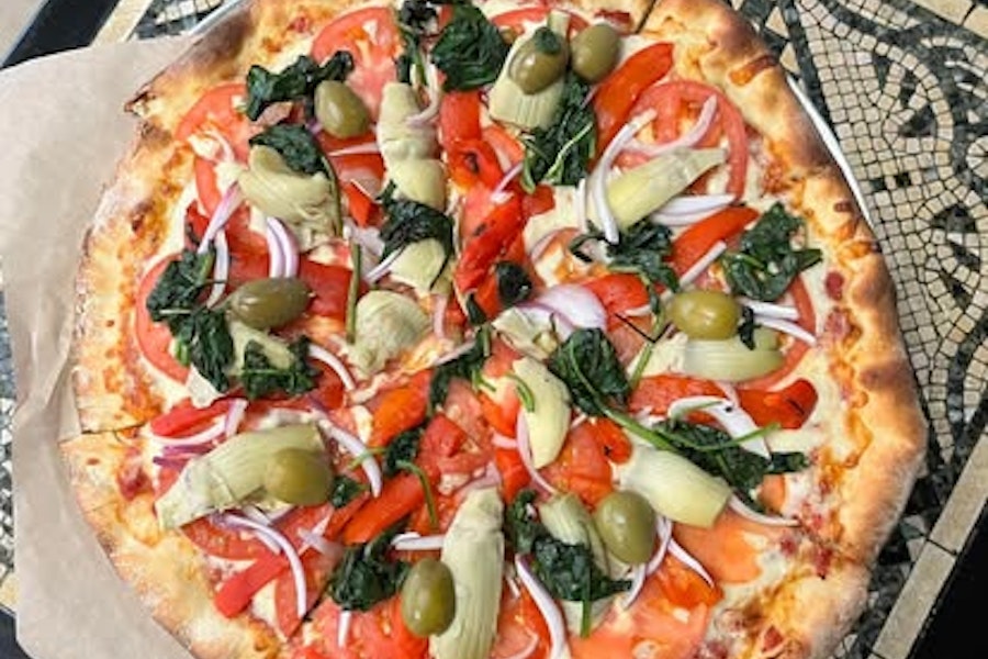 Artichoke, roasted red pepper, onion, tomato, fresh basil, spinach, topped with oregano and one green olive per slice