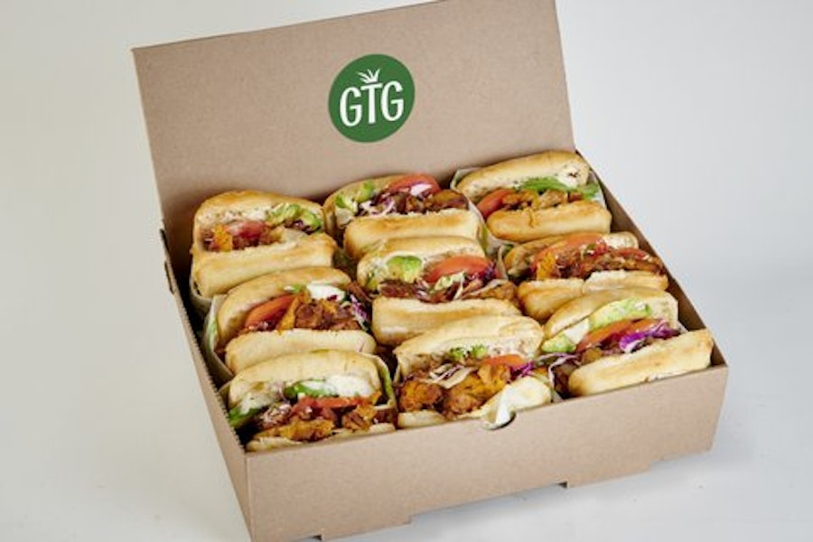 Plant-based beyond chicken tenders tossed in nashville hot sauce, topped with cabbage slaw, pickles, and vegan ranch on a grilled brioche bun