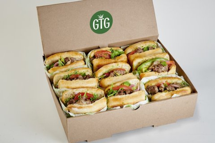 Beyond meat patty, vegan cheddar cheese, grilled onion, grilled mushroom, arugula, tomato, pickle, and vegan dijonnaise on a grilled brioche bun