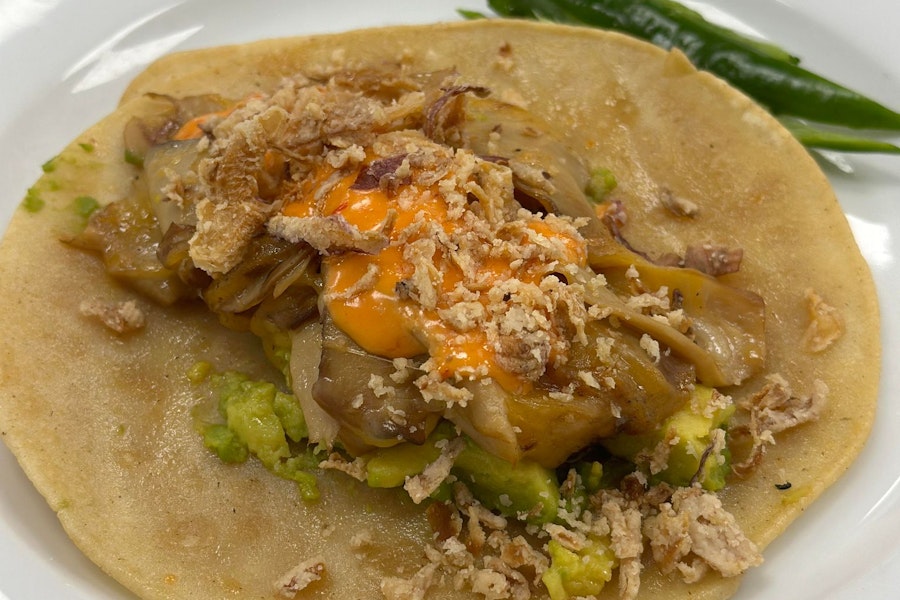 Two corn tortilla tacos with marinated king oyster mushrooms, avocado, cheddar-jack cheese, crispy onions, and calabrian chili herb veganaise. Served with house chips and hp-style guacamole