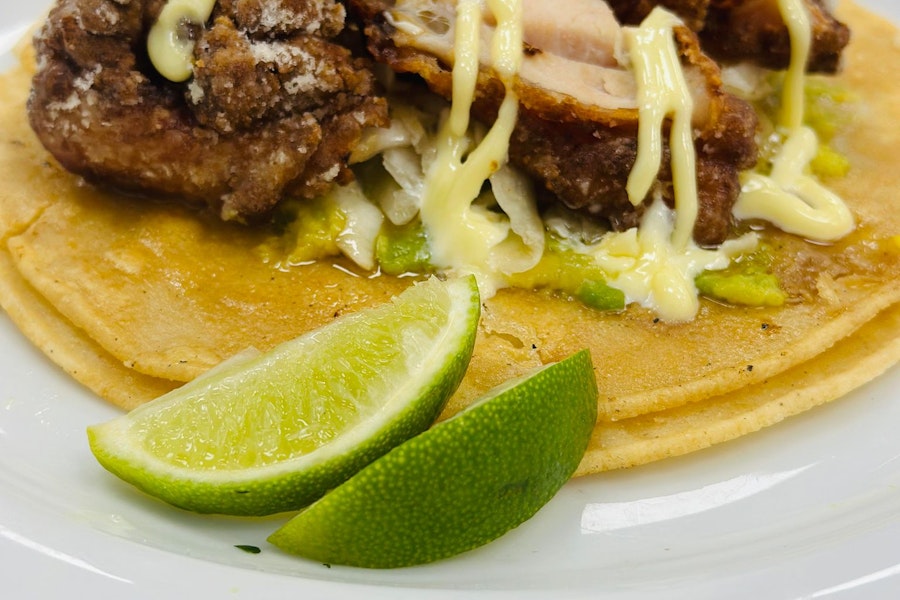 Two corn tortilla tacos with japanese-style fried chicken, cabbage, avocado, and kewpie mayo. Served with house chips and hp-style guacamole