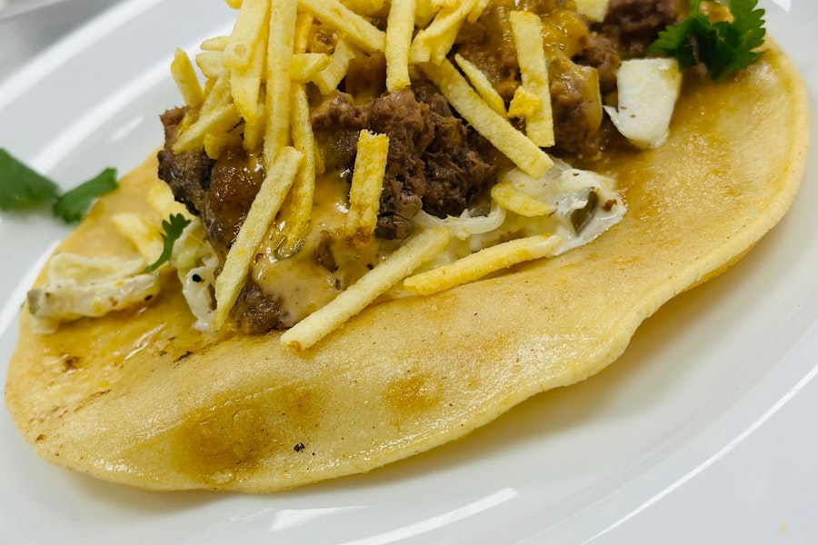 Two corn tortilla tacos with seasoned beef, coleslaw, cheddar-jack cheese, crispy potato sticks, and jalapeno thousand island. Served with house chips and hp-style guacamole