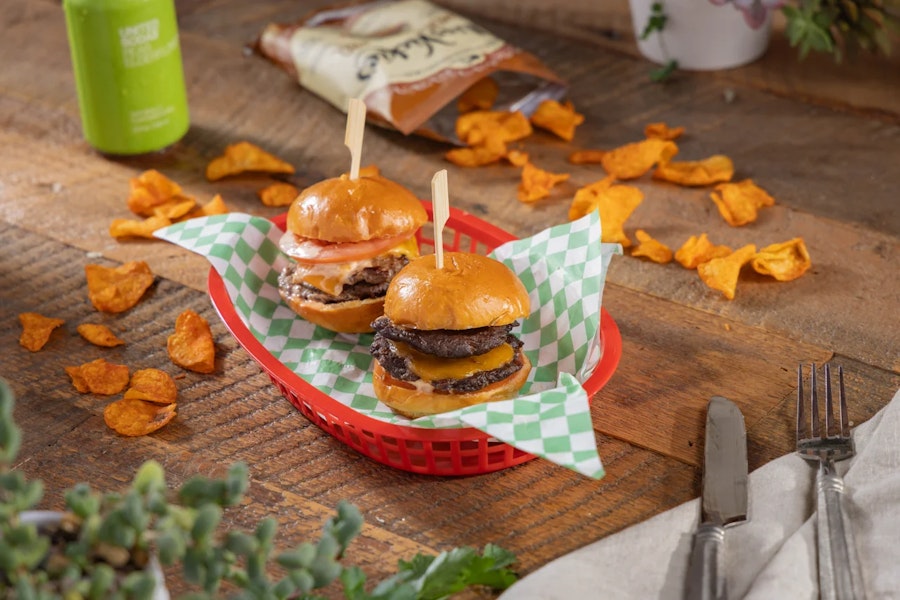 A hearty grass-fed beef patty topped with pepper jack cheese, crispy shallots, green pepper, tangy bbq sauce, on a soft slider bun, with fresh lettuce and tomato