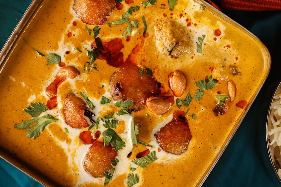 Fried vegetable dumplings with nuts (kofta) in a rich cashew-based curry sauce with indian seasoning