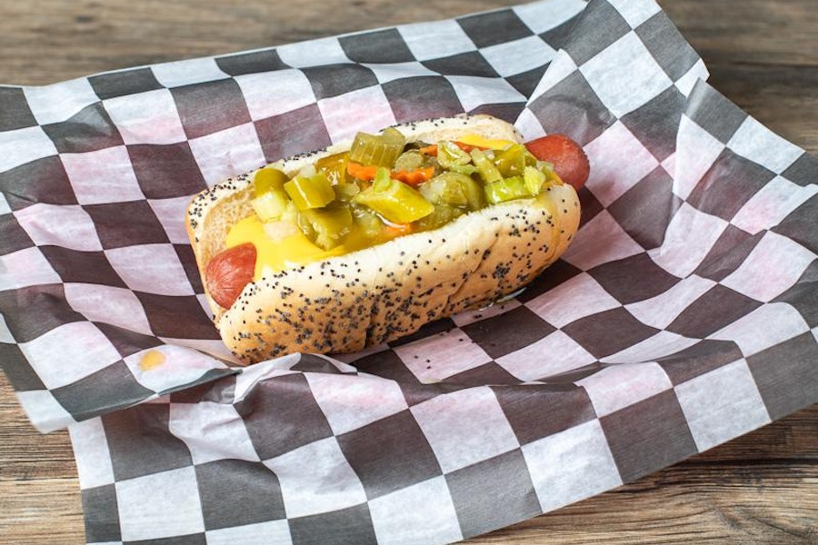 All-beef hot dog topped with cheese sauce and hot giardiniera peppers. A new classic!
