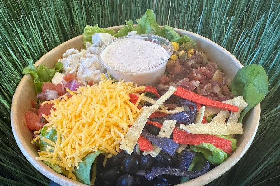 Chicken, greens, bacon, black beans, corn, pico de gallo, cheddar, tortilla strips and spicy ranch