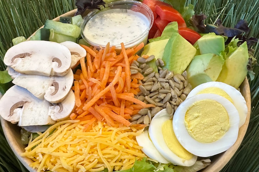 Avocado, egg, greens, cucumber, tomato, carrot, mushroom, cheddar, sunflower seeds and ranch