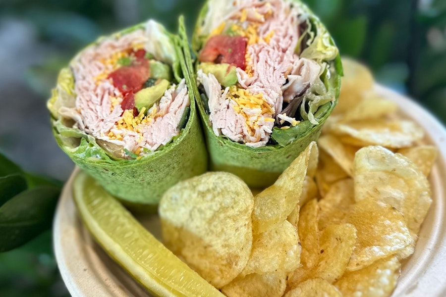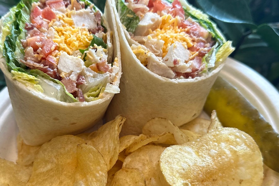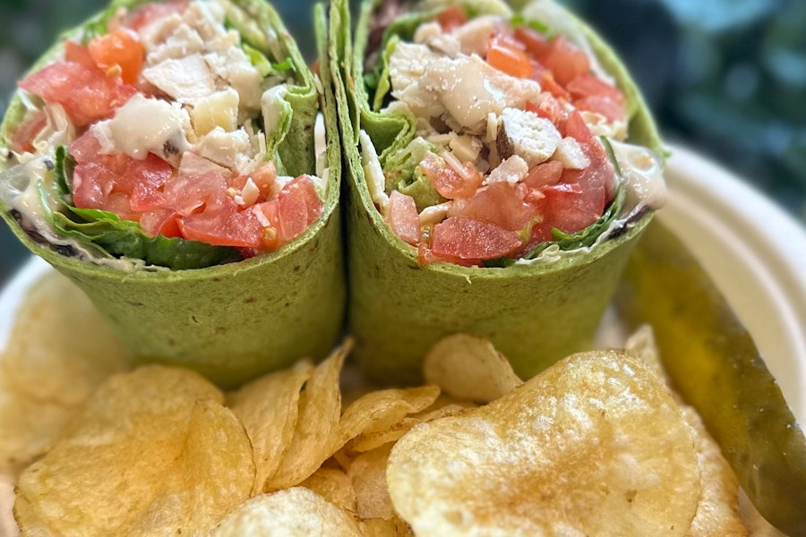 Wraps are made with plain flour tortillas Sandwiches and wraps come with chips and a pickle on the side