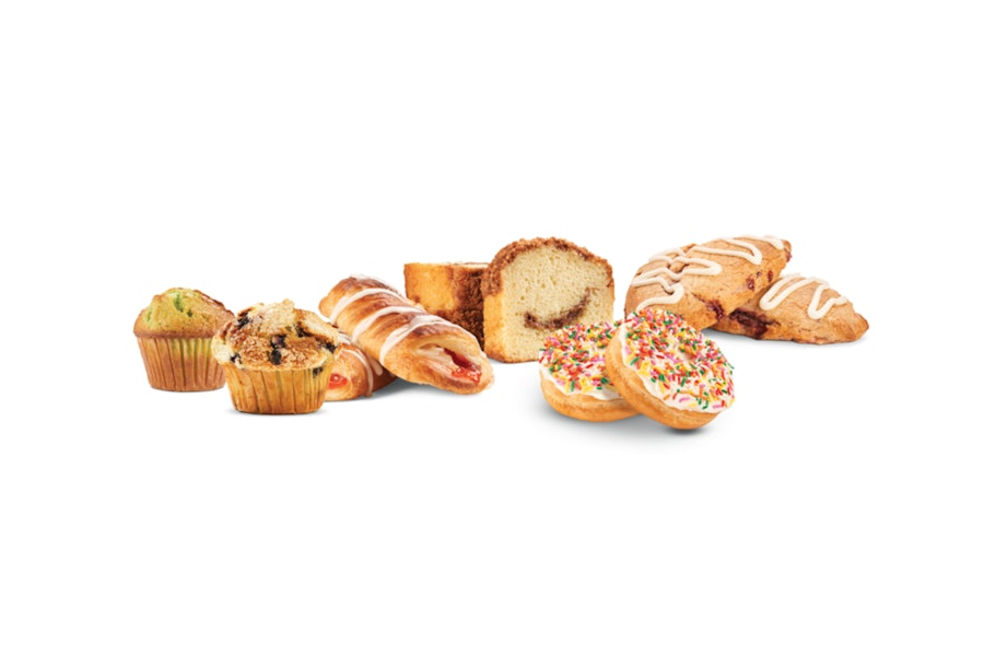 Includes two blueberry, two pistachio, two double chocolate chip & two lemon poppyseed muffins and two strawberry cream cheese croissants, two slices of cinnamon coffee cake & one chocolate avalanche croissant