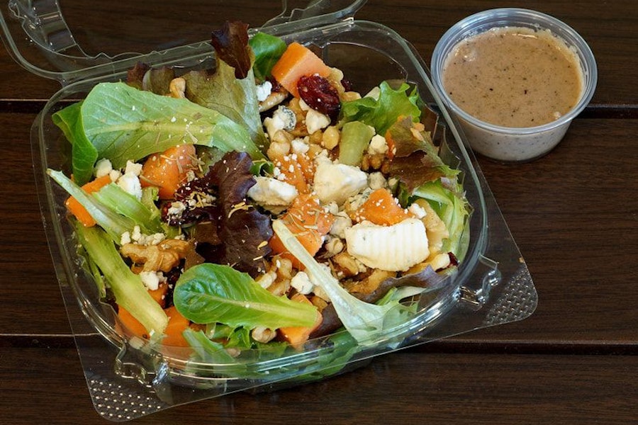 Greens with pear, candied pecans, avocado, blue cheese crumbles, and italian vinaigrette