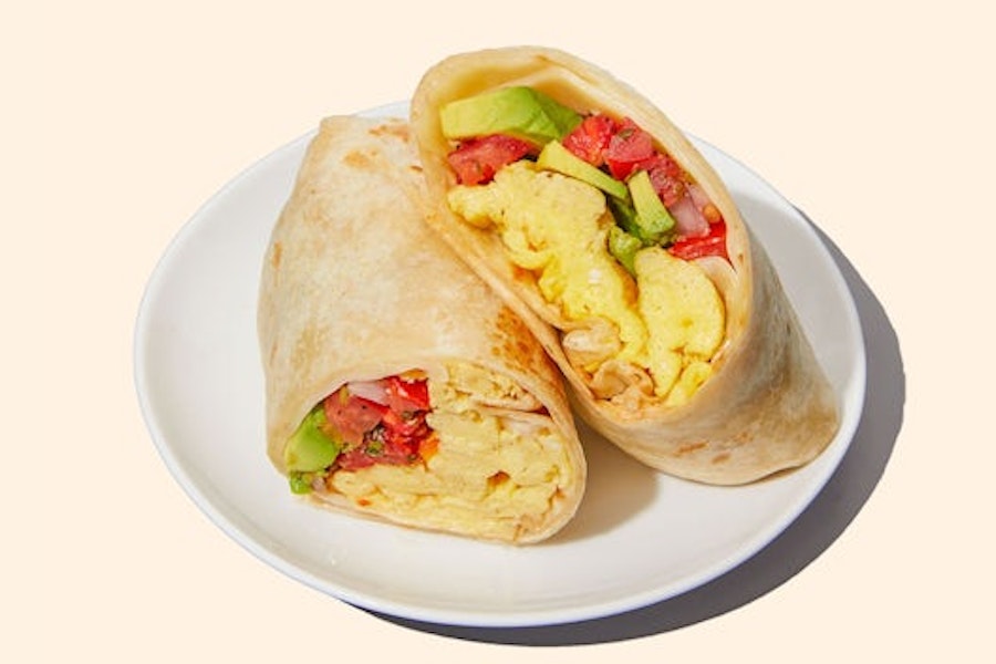 Scrambled egg whites, salsa, avocado & swiss cheese wrapped in a flour tortilla