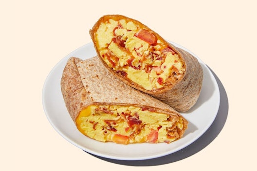 Scrambled egg whites, bacon, cheddar cheese & tomatoes wrapped in a whole wheat tortilla