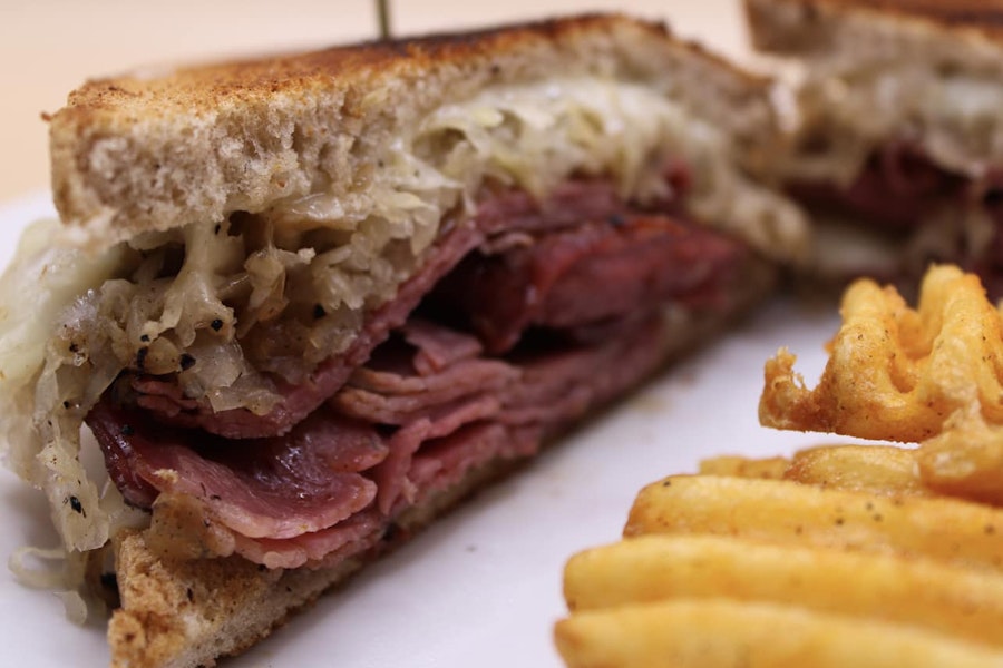 Corned beef braised on-site and sliced to order. Melted swiss cheese and sauerkraut on toasted marble rye with 1000 island dressing
