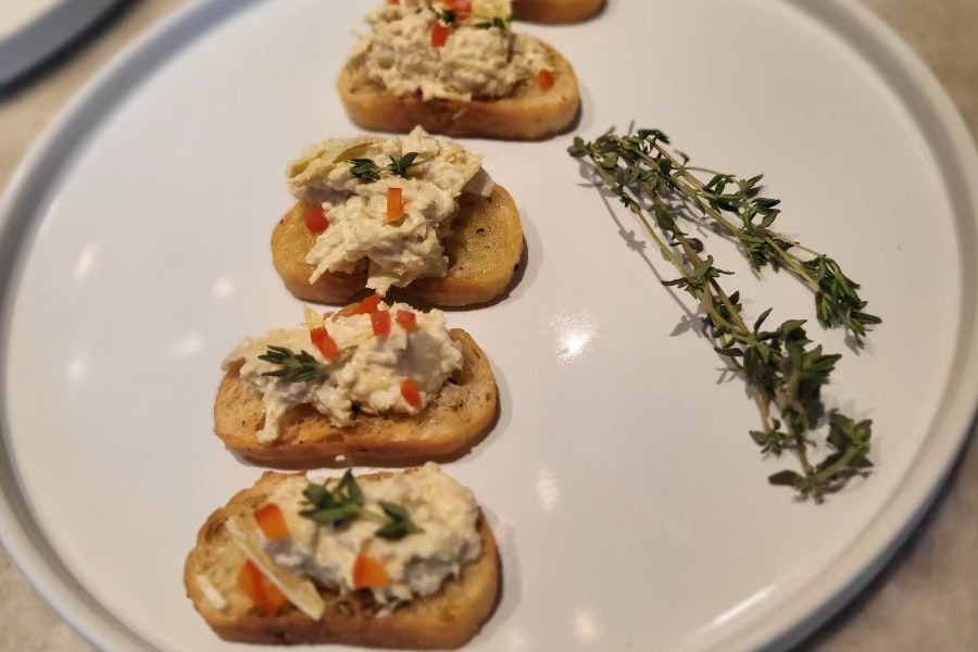 Crisp toasted bread rounds topped with parmesan artichoke dip, tomato bruschetta, and olive tapenade spreads