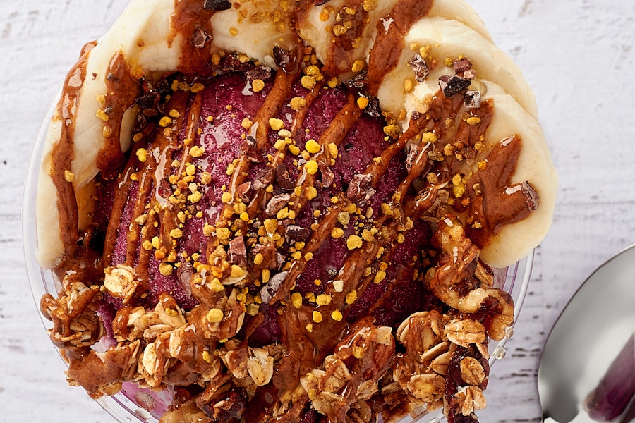 Our acai base is packed full of antioxidants and then topped with our homemade gluten-free granola (contains tree-nuts), fresh banana, cacao nibs, bee pollen and topped with honey and almond butter