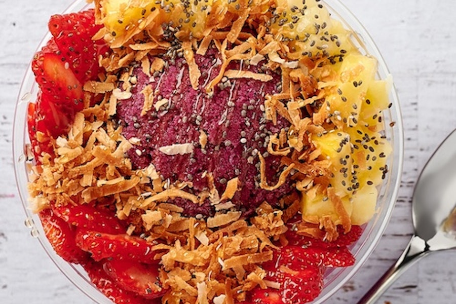 A brazilian supertreat with an acai, pitaya & coconut milk base topped with strawberries, fresh pineapple, toasted coconut, chia seeds, honey