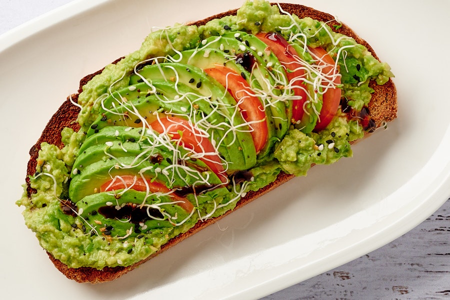 Fresh whole avocado, tomatoes, sprouts, uj gravel (everything bagel-style seasoning), on sunflower bread