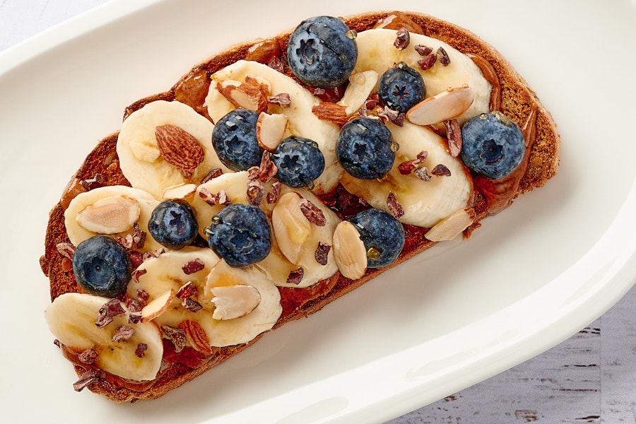 Almond butter, bananas, honey, toasted almonds, cacao nibs, & fresh blueberries on sunflower bread