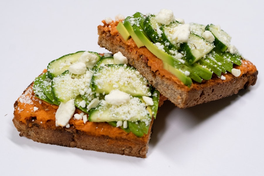 House-made hummus, avocado, english cucumber, sprouts, lemon, krazy jane's seasoning on sunflower bread - no feta