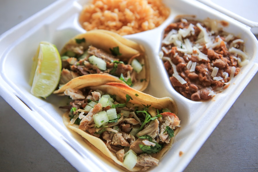 Each box includes two tacos on corn tortillas with rice (contains chicken stock unless noted otherwise) & beans