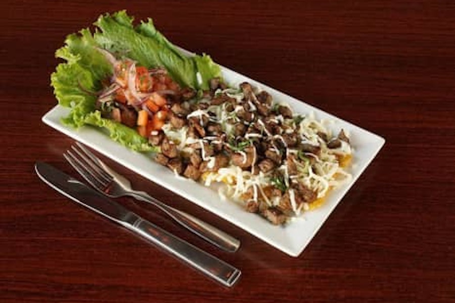 Beef patacones with mozzarella cheese topped with andes curtido & house sour cream sauce