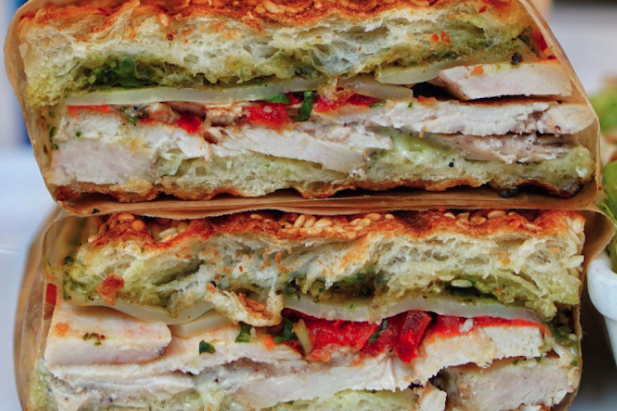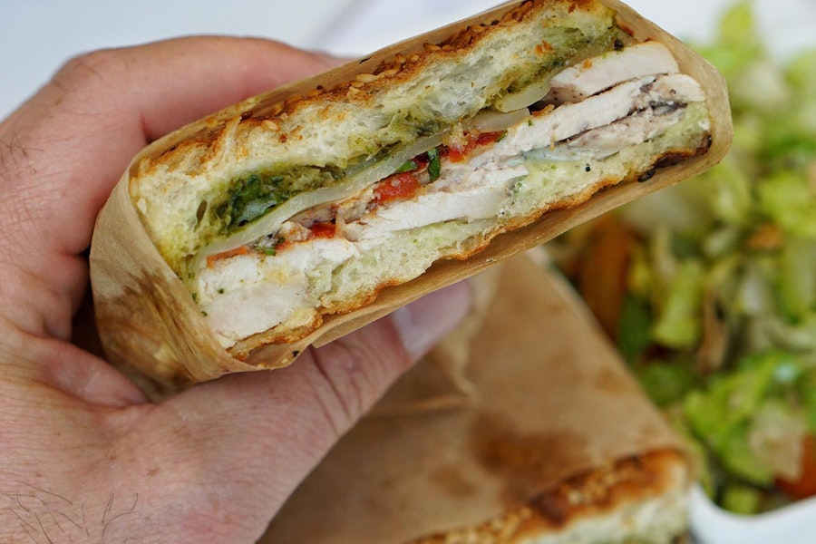 Grilled chicken breast, basil pesto, mozzarella, spinach, tomato, fresh basil on focaccia