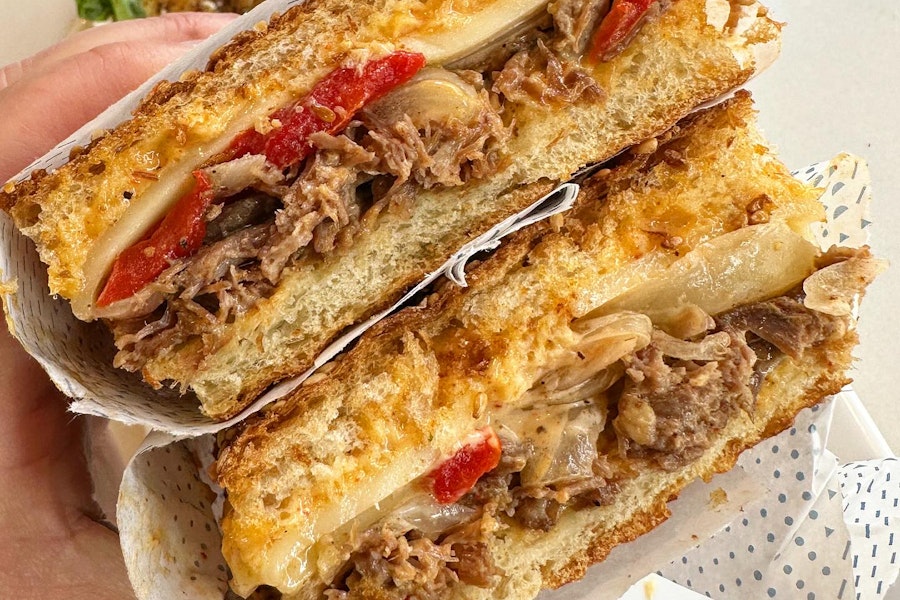 Caramelized onions, red peppers, provolone cheese, and smoked paprika aioli. Panini'd on barbari bread