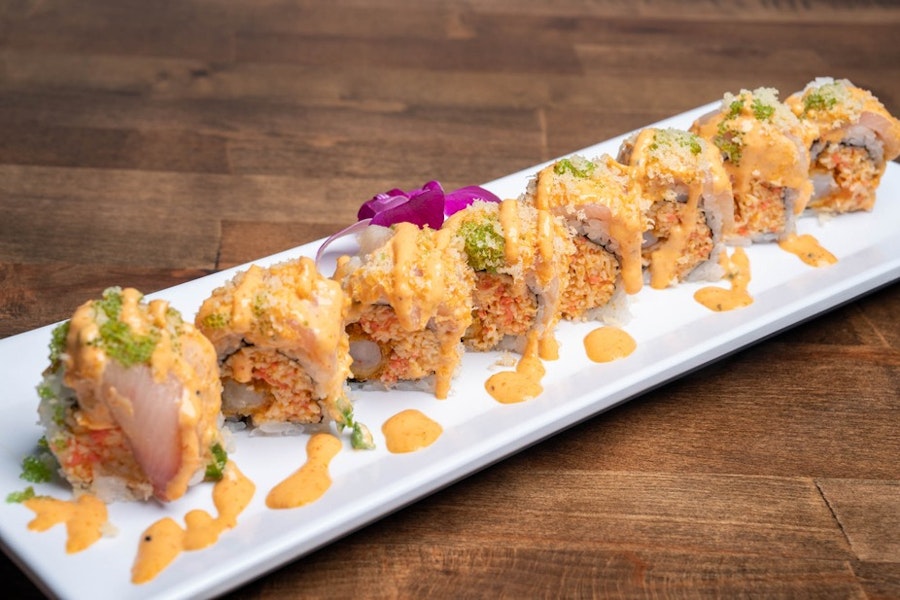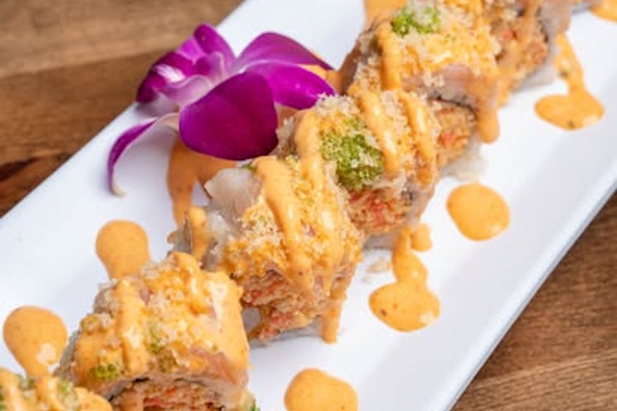 Shrimp tempura, cream cheese, avocado, topped with crunch and yum yum sauce