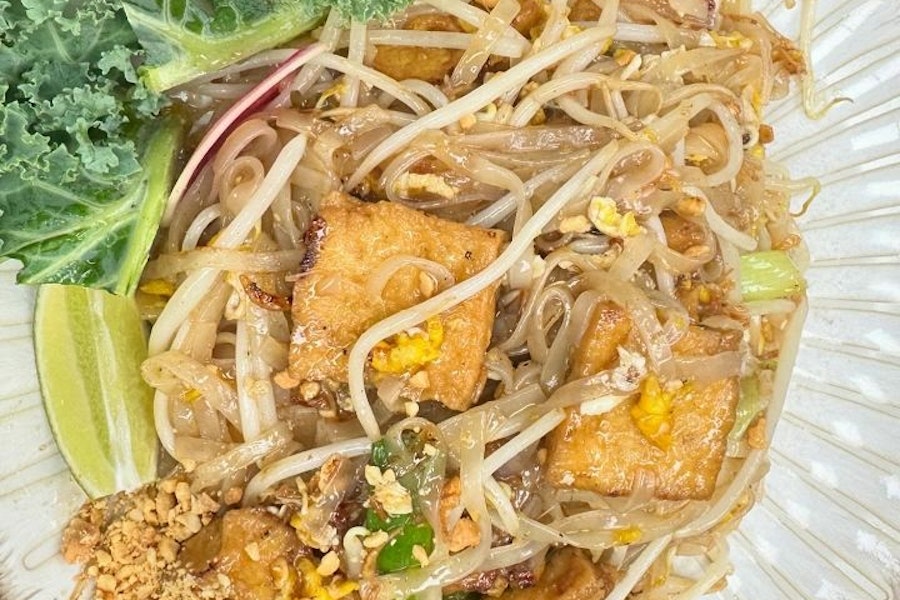 Classic rice noodles stir-fried with mixed vegetables, scallions, bean sprouts and vegan tamarind sauce (sauce contains gluten)