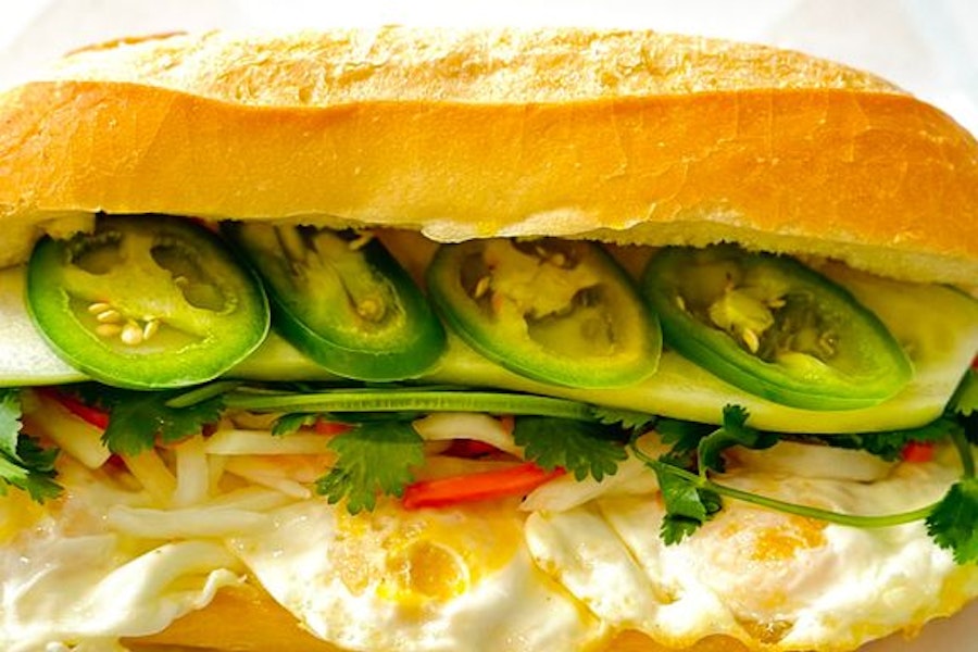 Vietnamese baguette with three eggs, mayo, pickled daikon & carrots, cucumber, cilantro & jalapeños