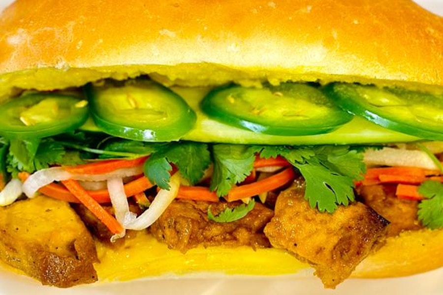 Vietnamese baguette with tofu, pickled daikon & carrots, cucumber, cilantro & jalapeños - no mayo