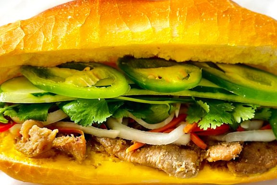 Vietnamese baguette with pork, mayo, pickled daikon & carrots, cucumber, cilantro & jalapeños