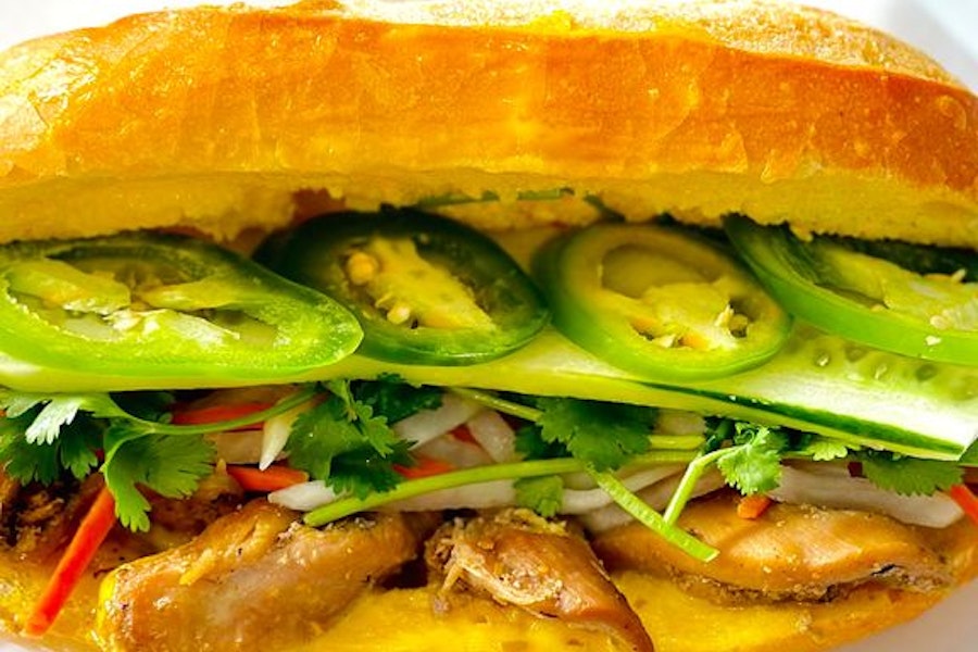 Vietnamese baguette with chicken, mayo, pickled daikon & carrots, cucumber, cilantro & jalapeños