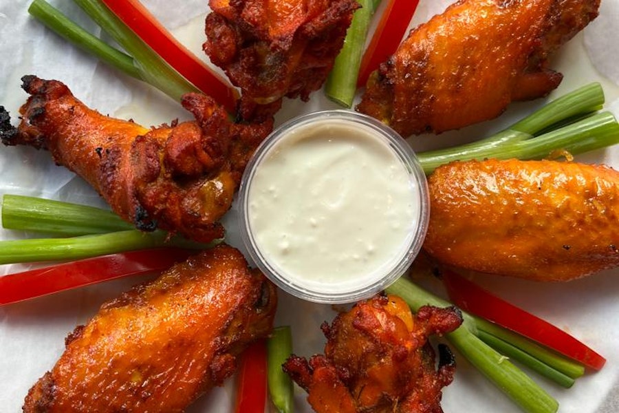 Jumbo wings served with ranch dipping sauce, carrots, and celery