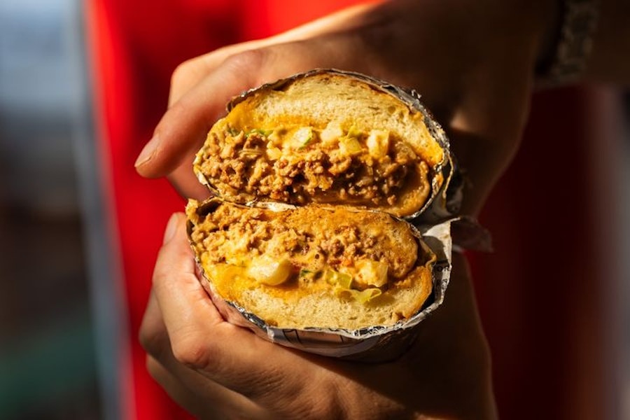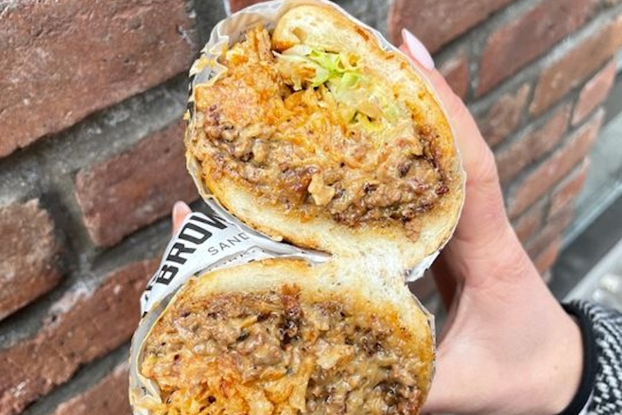 House-made roast beef in au jus, cheddar sauce, brown bag sauce, fried crispy onion, sesame hero