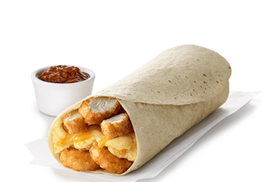 A hearty morning meal of spicy sliced chick-fil-a nuggets, scrambled eggs and a blend of monterey jack and cheddar cheeses. Rolled in a warm flour tortilla. Served with jalapeño salsa