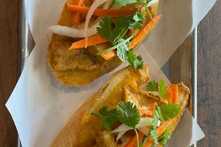Half of a vietnamese baguette with tofu, mayo, pickled daikon & cilantro