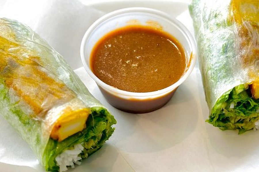 Rice wraps with tofu, vermicelli noodles, green lettuce, iceberg lettuce & herbs