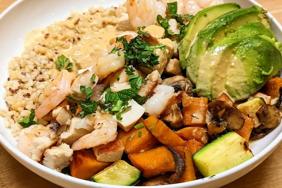 Sautéed greens, garlic mushrooms, zucchini, roasted sweet potatoes, cilantro, mint, with brown rice & quinoa and coconut curry sauce