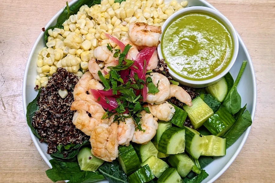 Avocado, tomato, red onion, red bell peppers, black beans, sautéed greens, cilantro, with brown rice & quinoa and pasilla pepper sauce
