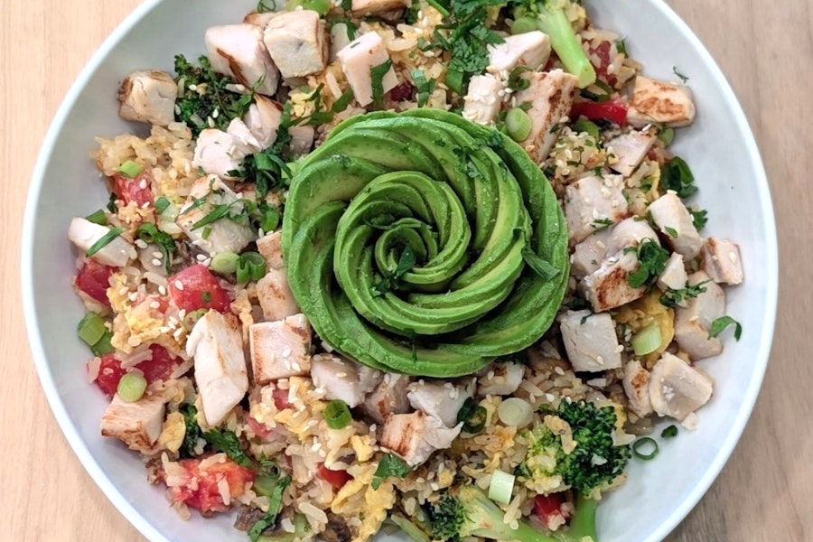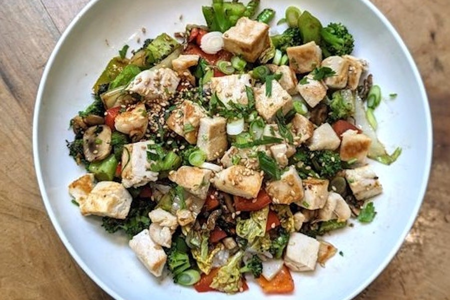 Broccoli, red bell pepper, mushrooms, jalapeño, napa cabbage, scallions, sesame seeds, cilantro, with jasmine white rice and tamari-citrus vinaigrette