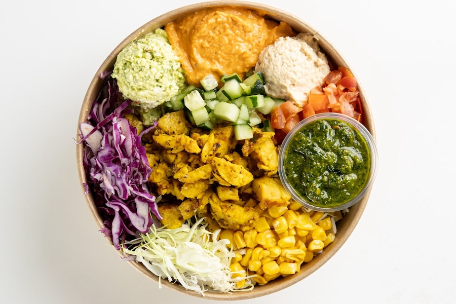 Chicken shawarma, zesty feta, traditional & harissa hummus, cucumber, cabbage, roasted corn, grandma's hot sauce
