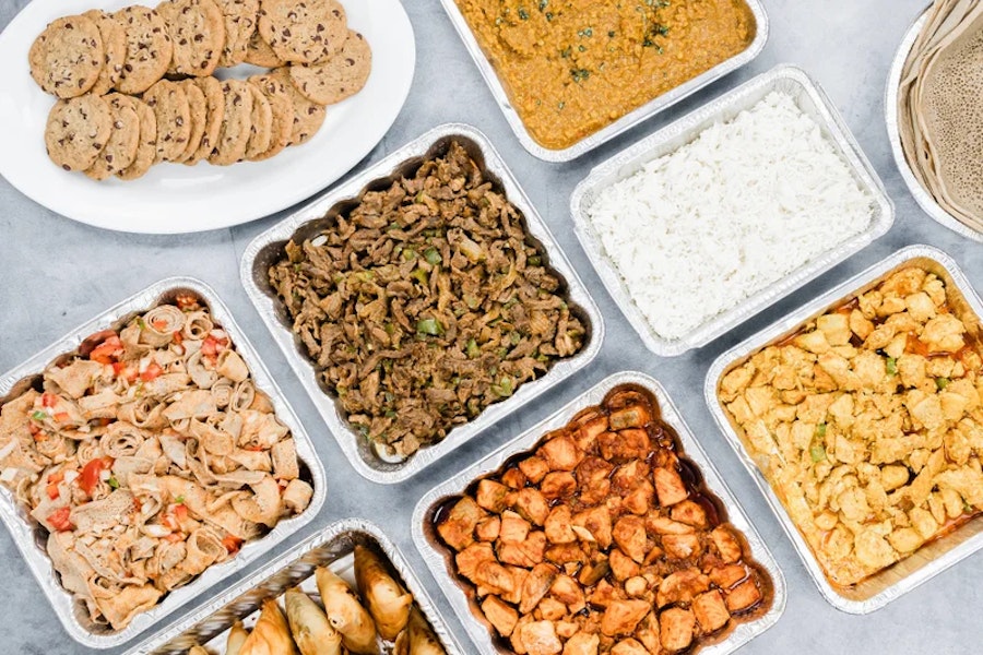 Experience the warmth of shared meals with a spread of flavorful stews, spiced meats, and vegan delights, all served with traditional injera.