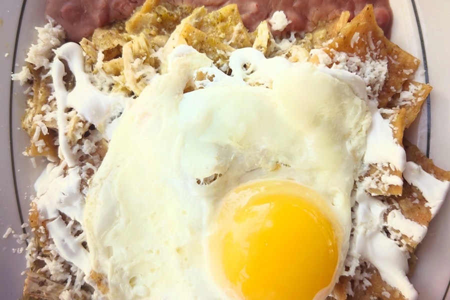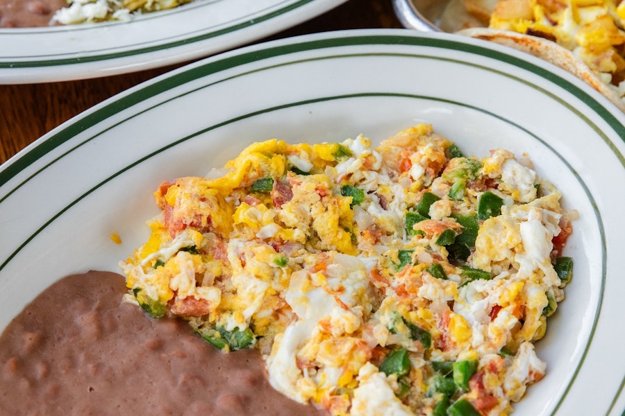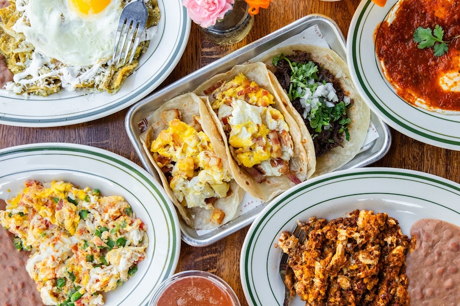 Indulge in a delicious selection of breakfast options, from classic huevos rancheros to zesty chilaquiles, all served with warm corn tortillas and refried beans